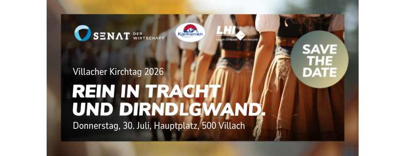 Gemeinsam mit unseren geschätzten Senatoren Helmut Petschar (Kärntnermilch) und René Tarmastin (LHI Euronationale Spedition) laden wir Sie herzlich ein, den Villacher Kirchtag zu erleben – das Highlight der Brauchtumswoche in Villachs wunderschön geschmückter Altstadt.